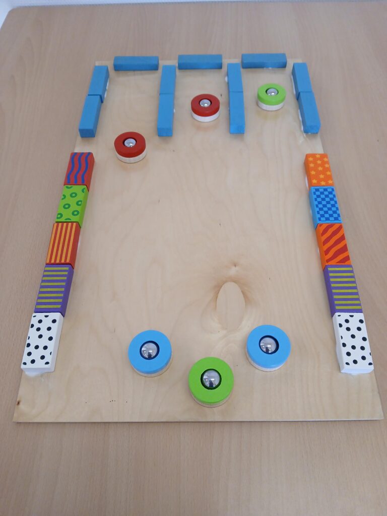 Werkwijze: samenspel met wedstrijd element. De schijven zijn makkelijk vooruit te schuiven en maakt de kans van slagen groot. Samenspel zorgt voor een leuk contactmoment met begeleiders en deelnemers.