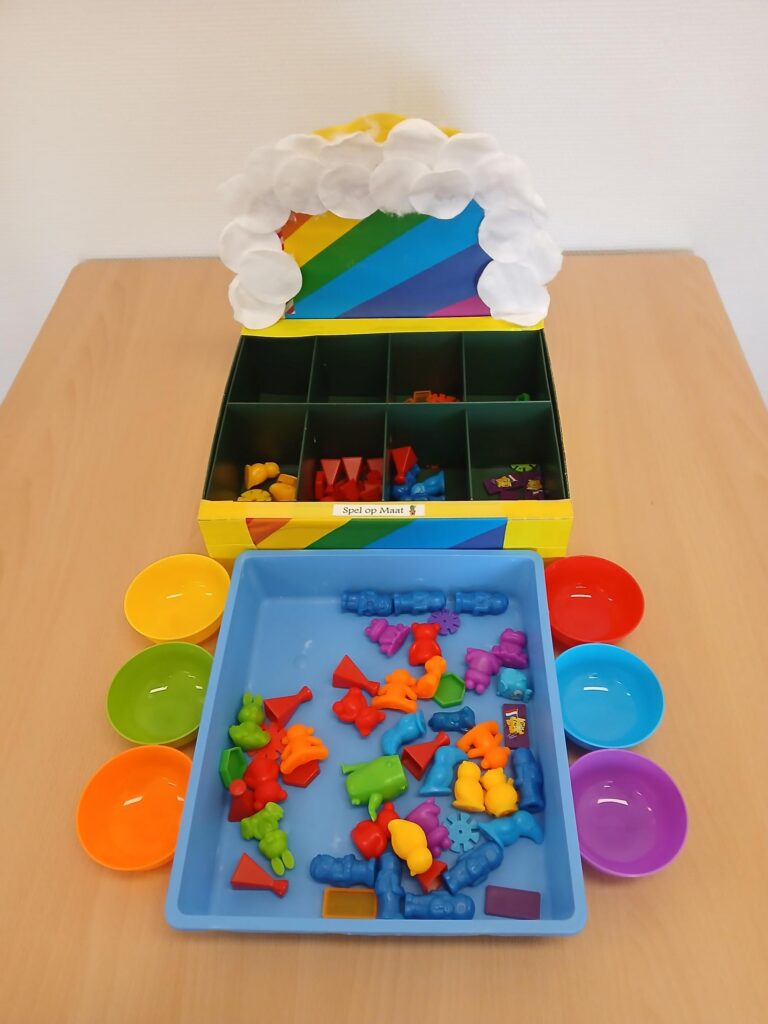 Werkwijze: sorteerwerkje. Dit werkje heeft een duidelijk begin en eind en doet o.a beroep op de kleuren differentiatie.