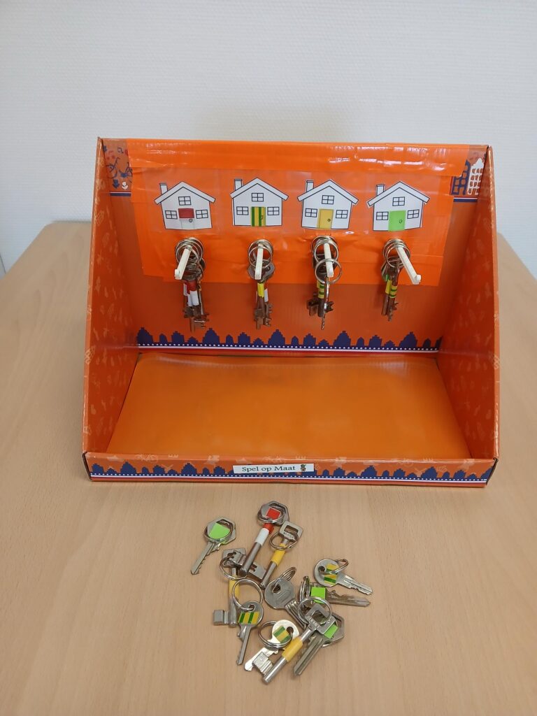 Werkwijze: de juiste sleutel bij het huisje hangen. Dit werkje doet o.a beroep op de beleving, ( het oogt wat volwassener,) kleurdifferentiatie en oog-/handcoördinatie.