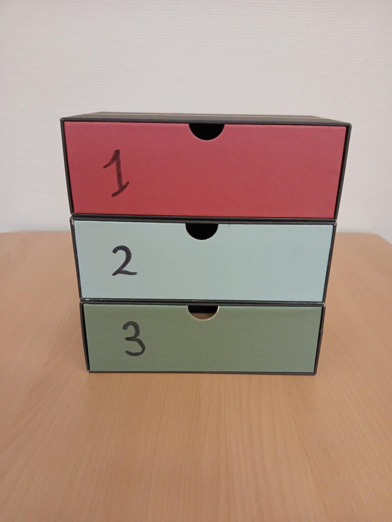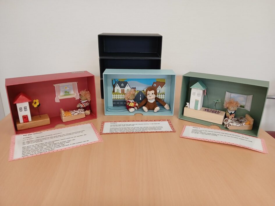 Benodigdheden: 3 klein lade doosjes, kleien attributen die bij de verhaal lijn passen.