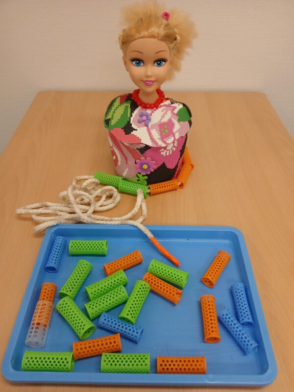 Benodigdheden: kapperspop, dik touw en krullers Werkwijze: grof aanrijgwerkje. Dit werkje heeft een duidelijk begin en eind en doet o.a beroep de beleving en oog/-handcoördinatie
