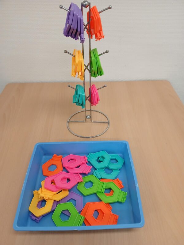 Benodigdheden: veel Ttriqo (constructiemateriaal) ,beker giraf. Een gat boren in de beker van de Giraf. Werkwijze: opsteekwerkje. Geschikt voor deelnemers die zich o.a wat langer kunnen concentreren en dit werkje doet beroep op de oog/-handcoördinatie.